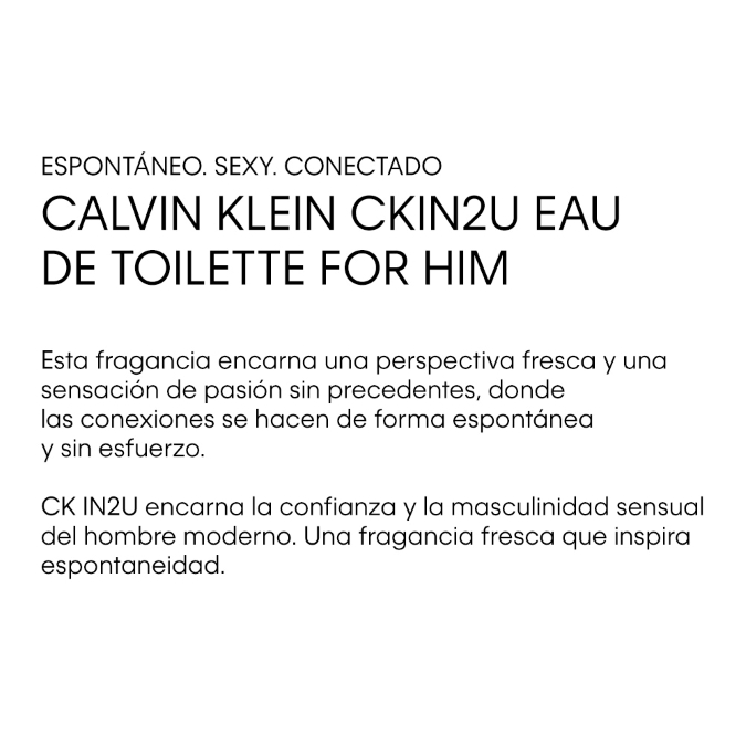 CK IN2U Masculino es una fragancia oriental amaderada y luminosa. La audaz y penetrante nota de ginebra de lima contrasta con el fresco almizcle para crear un viaje efervescente. Una perspectiva fresca sobre la espontaneidad, donde las mejores conexiones se hacen sin inhibiciones.