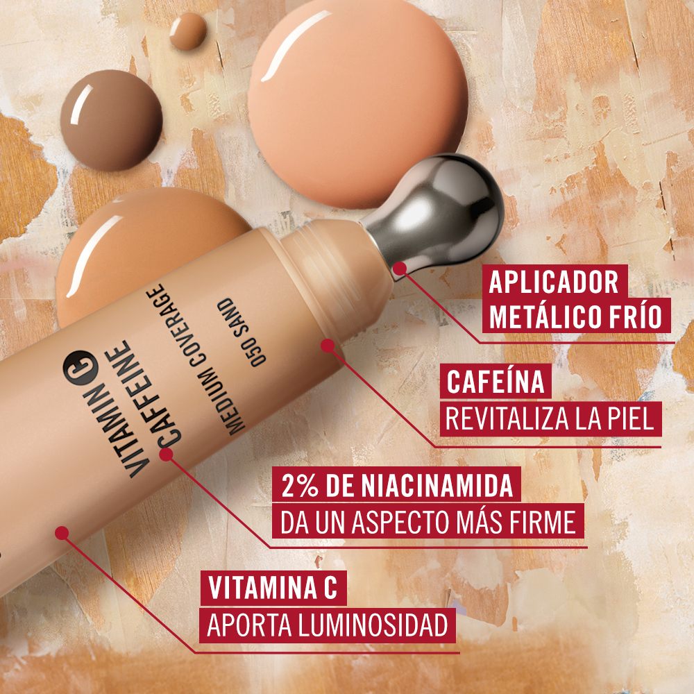 Fórmula modulable con un acabado radiante enriquecida con cafeína para despertar la piel, vitamina C para iluminar y unificar el tono de la piel y niacinamida al 2 % para una piel de aspecto más firme.
